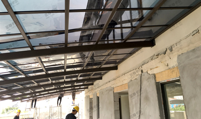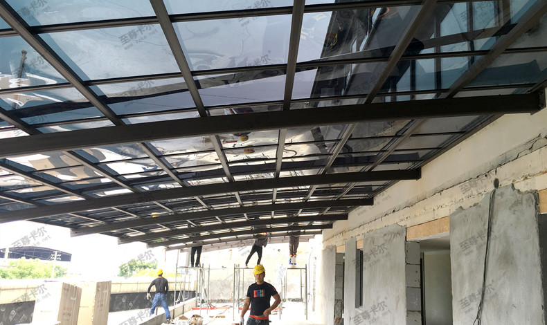 頂部用的是深灰色2.0mm聚碳酸酯板材,透光性能好(透光率88%)在陽光下曝曬不會產生黃變、霉化、透光不佳。表面有防紫外線的共擠層(uv涂成),可防止太陽紫外線引起的樹脂疲勞變黃。表面共擠層具有化學吸收紫外線并轉化為可見光。對植物光合作用有良好的穩定效果,極適合保護汽車等 產品使其免受紫外線破壞。