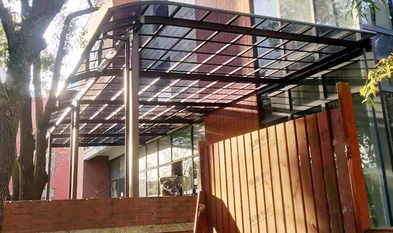 頂部用的是2.0mm聚碳酸酯板材,透光性能好(透光率88%)在陽光下曝曬不會產生黃變、霉化、透光不佳。表面有防紫外線的共擠層(uv涂成),可防止太陽紫外線引起的樹脂疲勞變黃。表面共擠層具有化學吸收紫外線并轉化為可見光。對植物光合作用有良好的穩定效果,極適合保護汽車使其免受紫外線破壞。