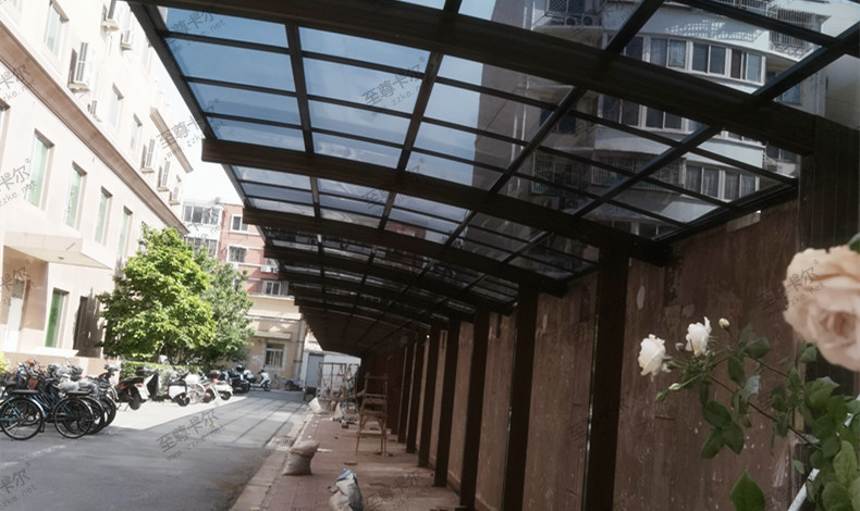 頂部用的是2.0mm聚碳酸酯板材,透光性能好(透光率88%)在陽光下曝曬不會產生黃變、霉化、透光不佳。表面有防紫外線的共擠層(uv涂成),可防止太陽紫外線引起的樹脂疲勞變黃。表面共擠層具有化學吸收紫外線并轉化為可見光。對植物光合作用有良好的穩定效果,極適合保護汽車使其免受紫外線破壞。