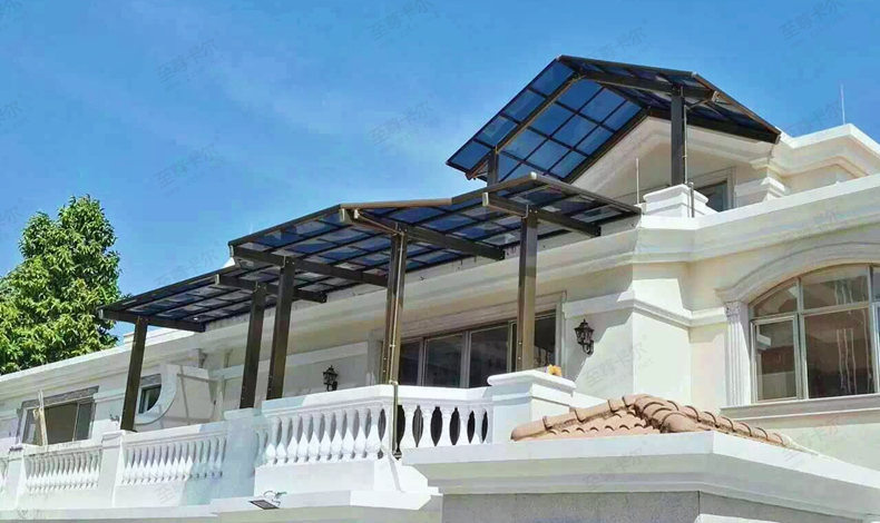 家庭建議使用鋁合金雨棚更加美觀顏色多樣可以設計想要的造型鋁合金也會更方便維護不生銹鋁合金骨架雨棚會更推薦耐力板棚頂聚碳酸酯板材抗沖擊性和穩定性更高不會像鋼化玻璃一樣具有自爆性造成安全隱患盡可能的避免了安全檢查問題